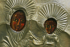 Die in der Abbildung dargestellte Ikone stammt aus der ersten Hälfte des 19. Jh. und stellt die Mutter Gottes und Jesus dar. Die Marien-Ikone ist beinahe vollständig mit einer Messingverkleidung ummantelt, dem sogenannten Oklad, sodass nur die Gesichter der beiden Heiligen zum Vorschein kommen. Das Oklad dient dem Schutz der Bildnisse vor äußeren Einwirkungen, wie beispielsweise dem Ruß darunter stehender Kerzen.