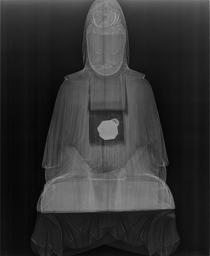 Auf der Röntgenaufnahme der Guanyin-Skulptur ist auffällig, dass in einem Hohlraum im Brustbereich sich ein achteckiger Gegenstand befindet, sowie ein Gegenstand mit einer Rundung. Aufnahmen des Computertomographen aus den Schichten des Brustbereiches zeigen ebenfalls ein Gegenstand, der auf Grund der strahlenden Darstellung aus Metall sein muss. Nach Absprache mit dem Besitzer der Skulptur wurde daraufhin die Klappe auf der Rückseite vorsichtig geöffnet. Im Inneren des Hohlraums kam zunächst ein Papierknäuel zum Vorschein, welches wahrscheinlich zum Schutz des weiteren Inhalts dient. Es stellte sich nach Herausnahme des Papierknäuels heraus, dass der achteckige Gegenstand eine Metallplatte ist. Mit mehreren bunten Fäden war diese mit einem kleinen Glöckchen verbunden und nochmals in Papier gewickelt. Außerdem befanden sich einige Getreidekörner, sowie ein weiteres Papierknäuel in dem Hohlraum. Ob diese Gegenstände Opfergaben oder Ähnliches darstellen, ist leider nicht zu belegen. Außerdem ist auf der Röntgenaufnahme zu erkennen, dass der Kopf separat eingesetzt worden ist. Die hellen Ränder und Linien an Stellen wie zum Beispiel dem Mund, den Augen und des Falten des Gewandes deuten auf eine verstärkte Ansammlung des Golds in diesen Partien hin.